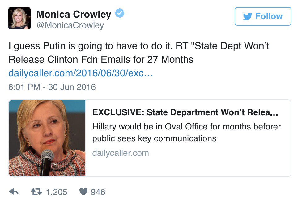 - CNN discovers over 50 instances of plagiarism in a 2012 book by Monica Crowley, Trump pick for national security communications. During the campaign, Crowley encouraged Vladimir Putin to reveal the Clinton emails -- how'd she know? Demonstrating its impeccable commitment to ethics, the Trump campaign issues a statement: "HarperCollins—one of the largest and most respected publishers in the world—published her book which has become a national best-seller. Any attempt to discredit Monica is nothing more than a politically motivated attack that seeks to distract from the real issues facing this country." Later we learn that large sections of her doctoral dissertation were plagiarized -- other works too.