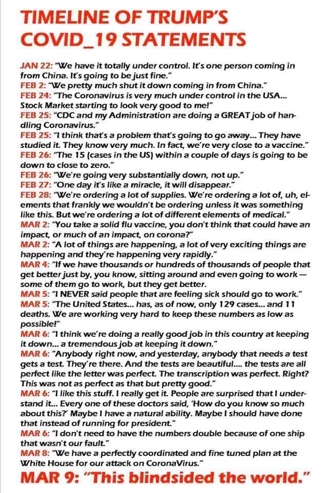 As late as March 11, Trump was still trying to control the damage. Even if he didn't hear about the threat until late January, a lie, that still doesn't excuse his conduct.If we are complacent and don’t do really aggressive containment and mitigation, the number could go way up and be involved in many, many millions. If we contain we could flatten it.Many, many millions.